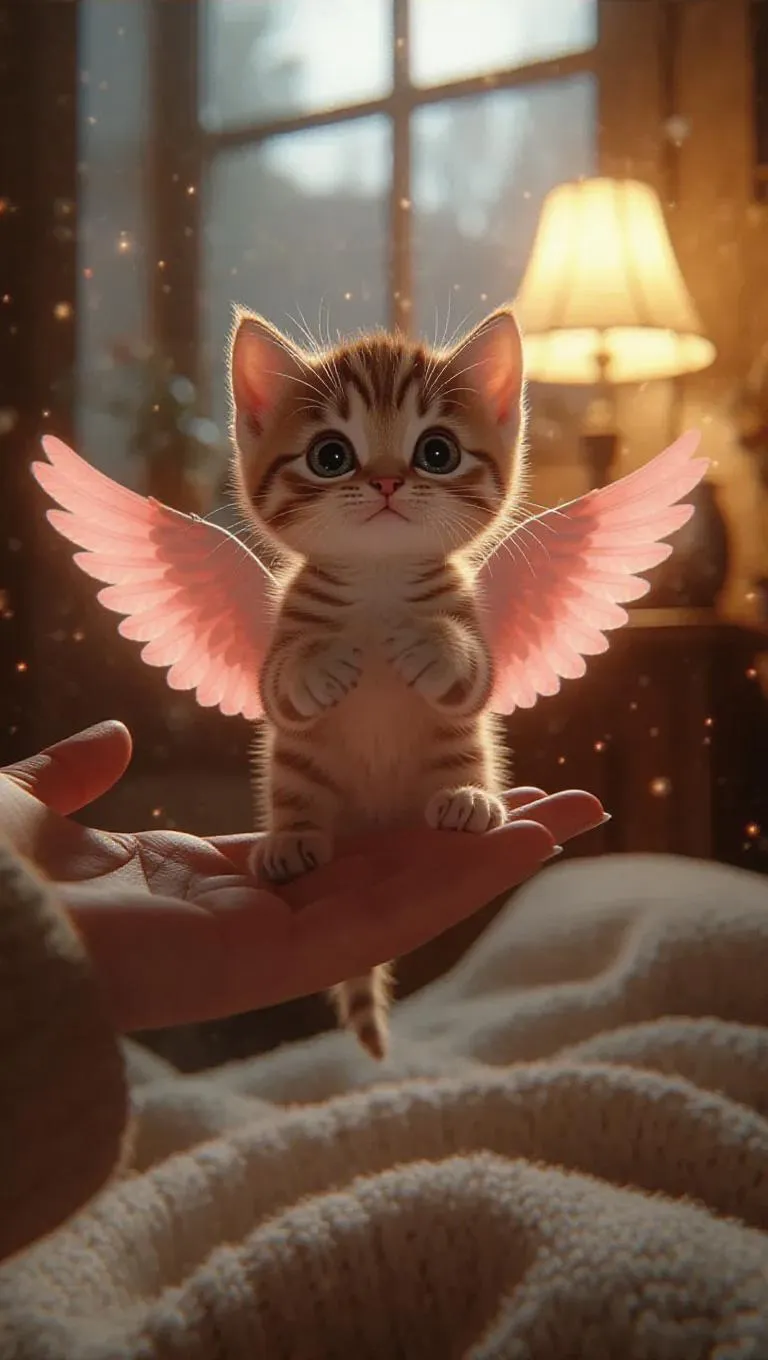 A little kitten with pink wings on its back clings to the end of someone's finger. The little kitten wiggles its wings, floats up, and slowly hovers. The scene is set in a cozy, warm room with soft blankets and a glowing lamp, creating a comforting and intimate atmosphere. The style is inspired by digital 3D rendering, with smooth textures and realistic lighting.
