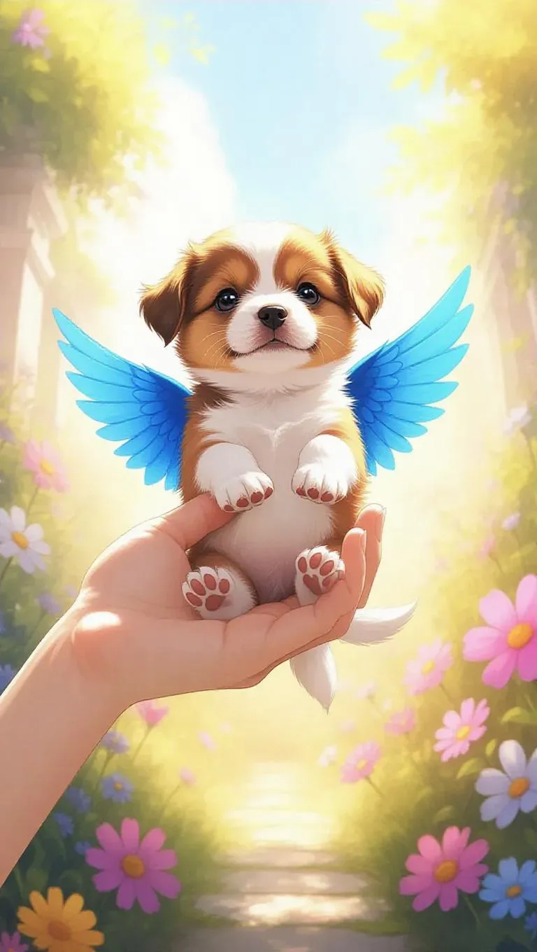A little puppy with blue wings on its back clings to the end of someone's finger. The little puppy wiggles its wings, floats up, and slowly hovers. The scene is set in a sunny garden with colorful flowers and a bright sky, creating a cheerful and lively atmosphere. The style is inspired by watercolor painting, with soft edges and vibrant colors.