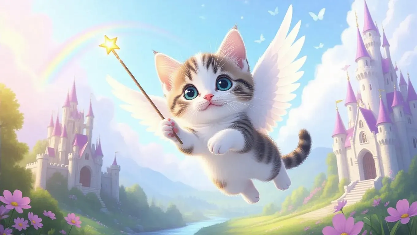A little kitten with white wings on its back clings to the end of a wand. The little kitten wiggles its wings, floats up, and slowly hovers. The scene is set in a whimsical fairy tale land with castles and rainbows, creating a magical and adventurous atmosphere. The style is inspired by children's book art, with colorful drawings and imaginative landscapes.