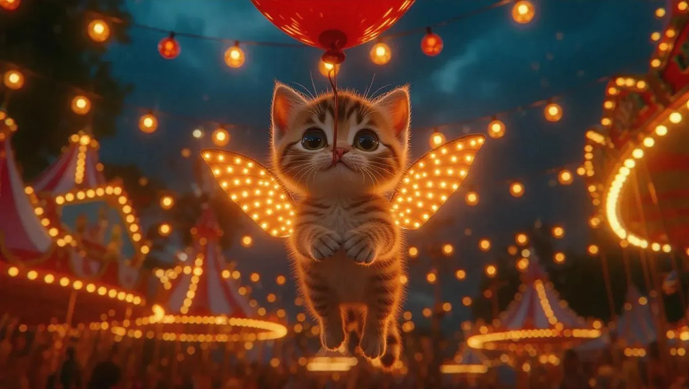 A little kitten with sparkling wings on its back clings to the end of a balloon. The little kitten wiggles its wings, floats up, and slowly hovers. The scene is set in a festive carnival with bright lights and joyful music, creating an exciting and festive atmosphere. The style is inspired by animation, with exaggerated features and playful elements.