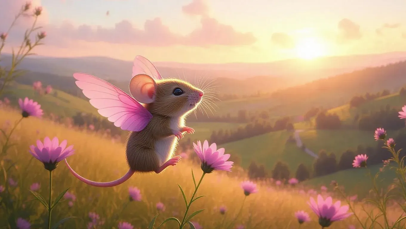 A little mouse with pink wings on its back clings to the end of a small flower. The little mouse wiggles its wings, floats up, and slowly hovers. The scene is set in a peaceful countryside with rolling hills and a sunset, creating a serene and picturesque atmosphere. The style is inspired by fantasy art, with dreamy landscapes and soft colors.