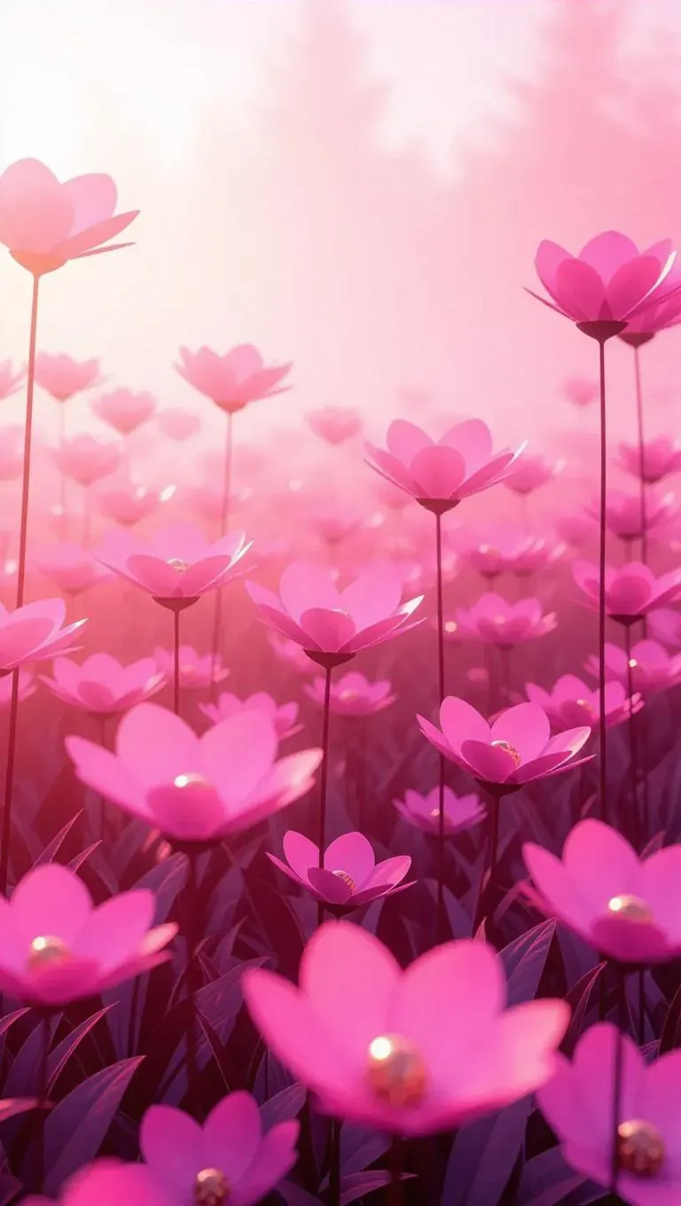 In an ethereal pink world, vast fields of flowers with petals like pink pearl and stems of luminous quartz create a mystical meadow. Pink mist hangs in the air, filtering soft, warm light that enhances the otherworldly atmosphere. The scene exudes a mysterious, magical realism style, blending the natural with the supernatural.