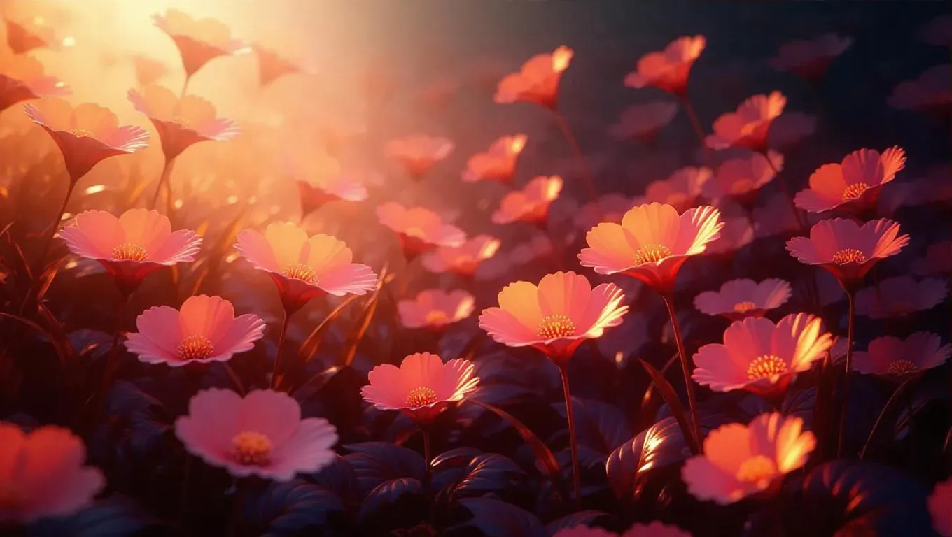 In an ethereal coral world, vast fields of flowers with petals like coral reefs and stems of glowing caramel create a mystical meadow. Coral mist hangs in the air, filtering soft, bright light that enhances the otherworldly atmosphere. The scene exudes a mysterious, magical realism style, blending the natural with the supernatural.