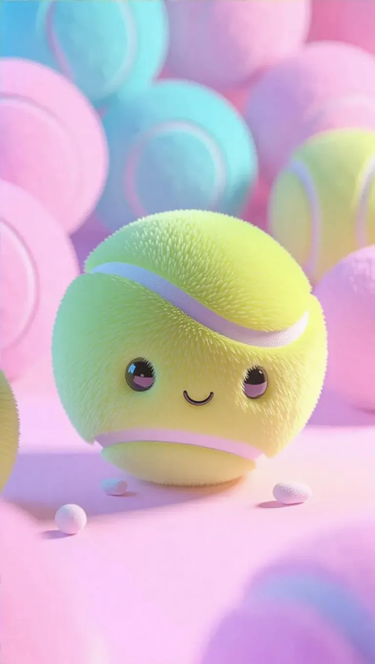 A whimsical depiction of a tennis ball in Jellycat style, where the ball is rendered as a giant, fluffy sphere of soft, green fur. The seams are depicted as plush, velvety lines, and the surface is soft and dreamy. The entire scene is bathed in cool, soft light, creating a serene and peaceful atmosphere. The style is playful and cuddly, perfect for a children's book or a cozy home decor piece.