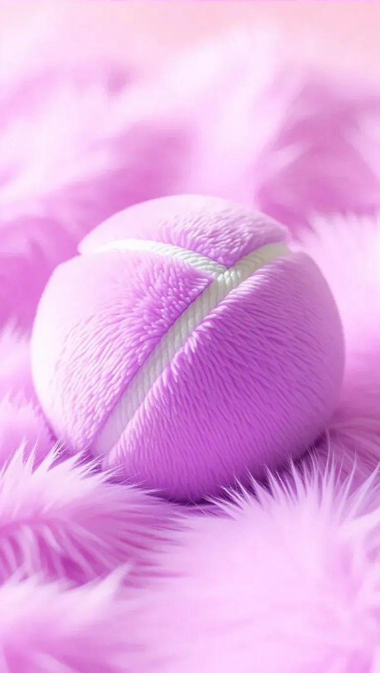 A whimsical depiction of a tennis ball in Jellycat style, where the ball is rendered as a giant, fluffy sphere of soft, purple fur. The seams are depicted as plush, velvety lines, and the surface is soft and dreamy. The entire scene is bathed in pastel, soft light, creating a dreamy and magical atmosphere. The style is playful and cuddly, perfect for a children's book or a cozy home decor piece.