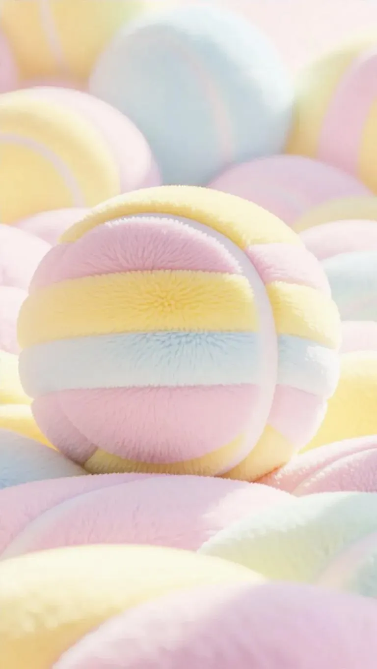 A whimsical depiction of a tennis ball in Jellycat style, where the ball is rendered as a giant, fluffy sphere of soft, striped fur. The seams are depicted as plush, velvety lines, and the surface is soft and dreamy. The entire scene is bathed in cheerful, soft light, creating a fun and lively atmosphere. The style is playful and cuddly, perfect for a children's book or a cozy home decor piece.