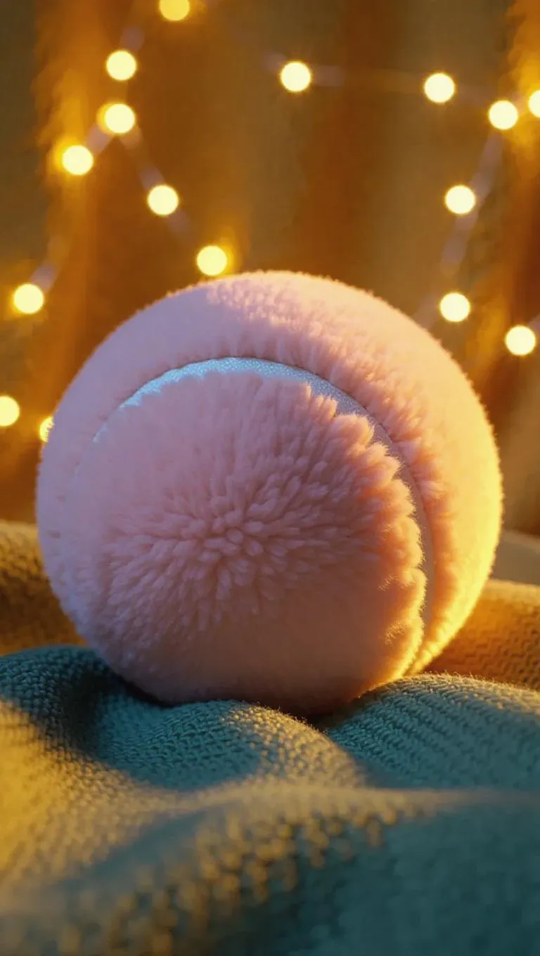 A whimsical depiction of a tennis ball in Jellycat style, where the ball is rendered as a giant, fluffy sphere of soft, pastel fur. The seams are depicted as plush, velvety lines, and the surface is soft and dreamy. The entire scene is bathed in soft, amber light, creating a cozy and inviting atmosphere. The style is playful and cuddly, perfect for a children's book or a cozy home decor piece.