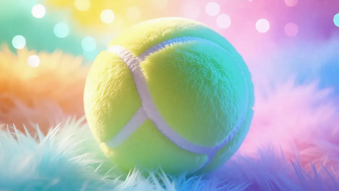 A whimsical depiction of a tennis ball in Jellycat style, where the ball is rendered as a giant, fluffy sphere of soft, multicolored fur. The seams are depicted as plush, velvety lines, and the surface is soft and dreamy. The entire scene is bathed in soft, glowing light, creating a vibrant and fun atmosphere. The style is playful and cuddly, perfect for a children's book or a cozy home decor piece.
