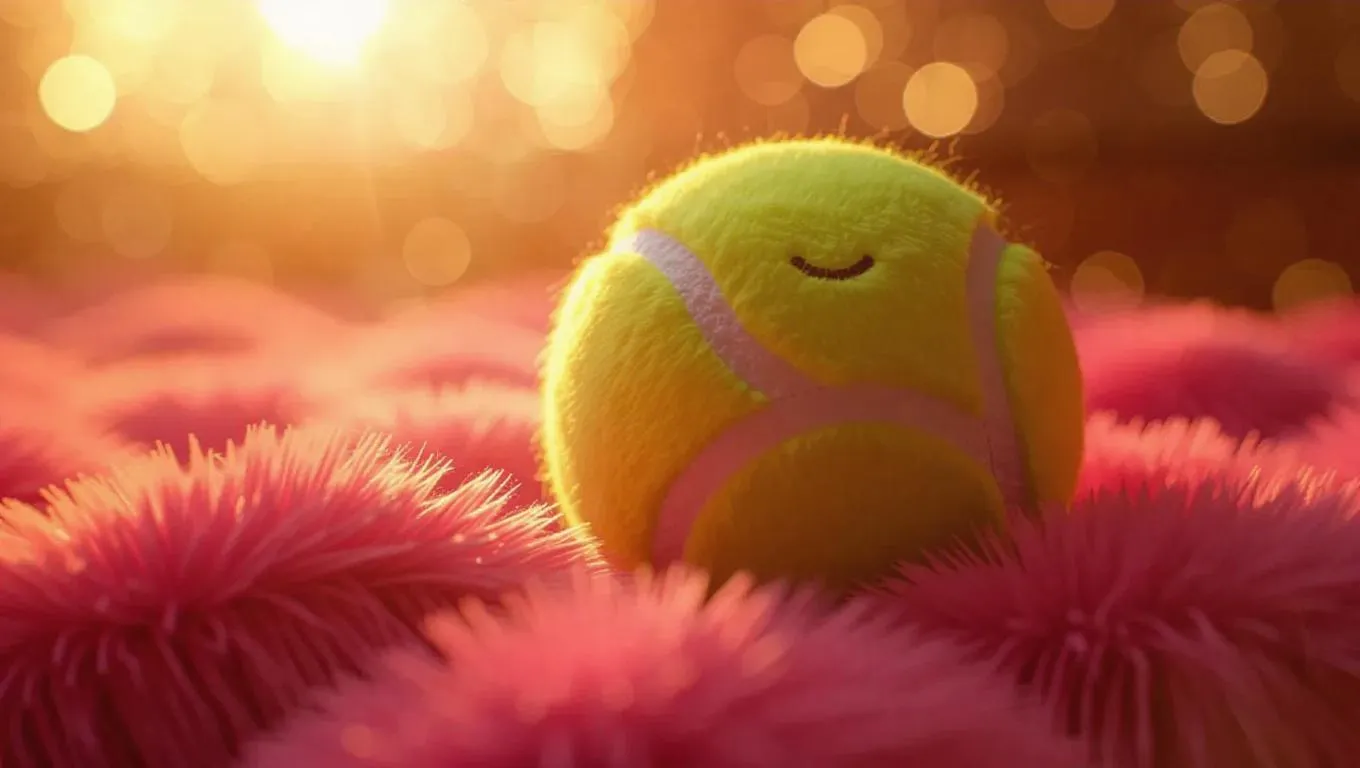 A whimsical depiction of a tennis ball in Jellycat style, where the ball is rendered as a giant, fluffy sphere of soft, flannel-like fur. The seams are depicted as plush, velvety lines, and the surface is soft and dreamy. The entire scene is bathed in soft, diffused light, creating a tranquil and cozy atmosphere. The style is playful and cuddly, perfect for a children's book or a cozy home decor piece.