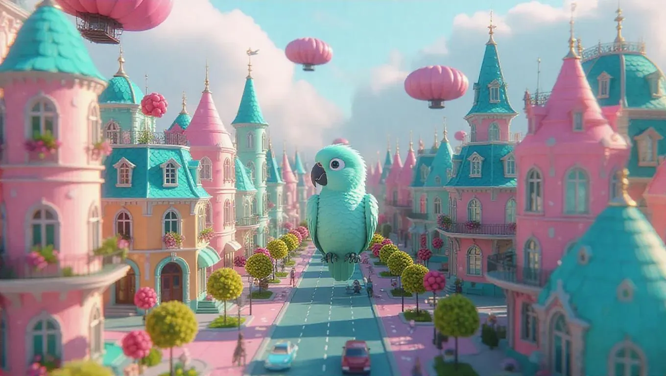 A pastel-colored cityscape viewed from above, where buildings and streets subtly form a fluffy, adorable parrot. The city features soft, fuzzy structures and rounded, pear-shaped buildings. Floating berry trees line the streets, and the roads are paved with jelly-like tiles. Warm turquoise light casts a soft, magical haze, enhancing the whimsical and kawaii aesthetic. Airships shaped like soft-feathered creatures gently float in the sky, contributing to the ultra-detailed, cinematic composition that balances realism and fantasy, evoking wonder and comfort. The style is inspired by digital 3D rendering, with smooth textures and vibrant colors.