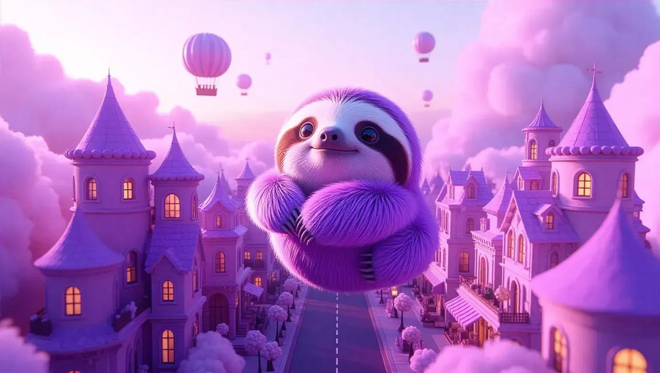 A pastel-colored cityscape viewed from above, where buildings and streets subtly form a fluffy, adorable sloth. The city features soft, fluffy structures and rounded, cloud-shaped buildings. Floating popcorn trees line the streets, and the roads are paved with cake-like tiles. Warm lavender light casts a soft, magical haze, enhancing the whimsical and kawaii aesthetic. Airships shaped like cuddly mammals gently float in the sky, contributing to the ultra-detailed, cinematic composition that balances realism and fantasy, evoking wonder and comfort. The style is inspired by digital 3D rendering, with smooth textures and vibrant colors.