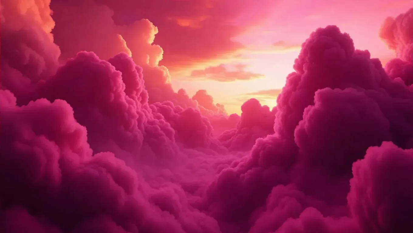 In a magical maroon world, colossal clouds with surfaces like maroon cotton candy and wisps of luminous garnet create a rich sky. Maroon mist hangs in the air, filtering soft, warm light that enhances the cozy atmosphere. The scene exudes a mysterious, magical realism style, blending the natural with the supernatural.