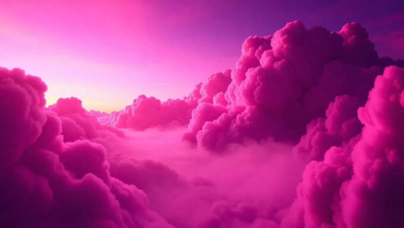 In a fantastic fuchsia world, colossal clouds with surfaces like fuchsia cotton candy and wisps of luminous magenta create a vibrant sky. Fuchsia mist hangs in the air, filtering soft, warm light that enhances the lively atmosphere. The scene exudes a mysterious, magical realism style, blending the natural with the supernatural.