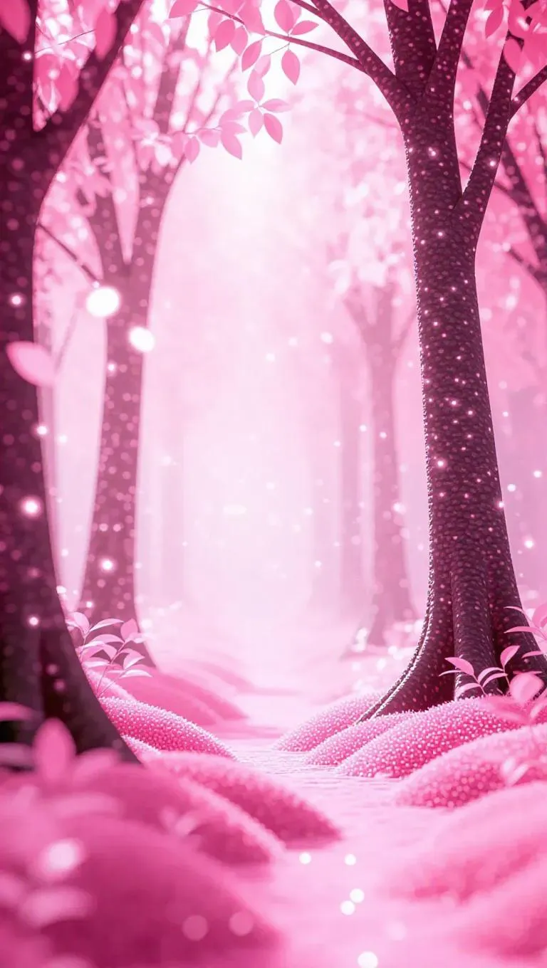 A magical pink world where trees have trunks made of pink crystal and leaves that sparkle like diamonds. The forest floor is covered in soft pink moss, and tiny, glowing creatures flit between the branches. Soft pink light filters through the canopy, creating a mystical ambiance.