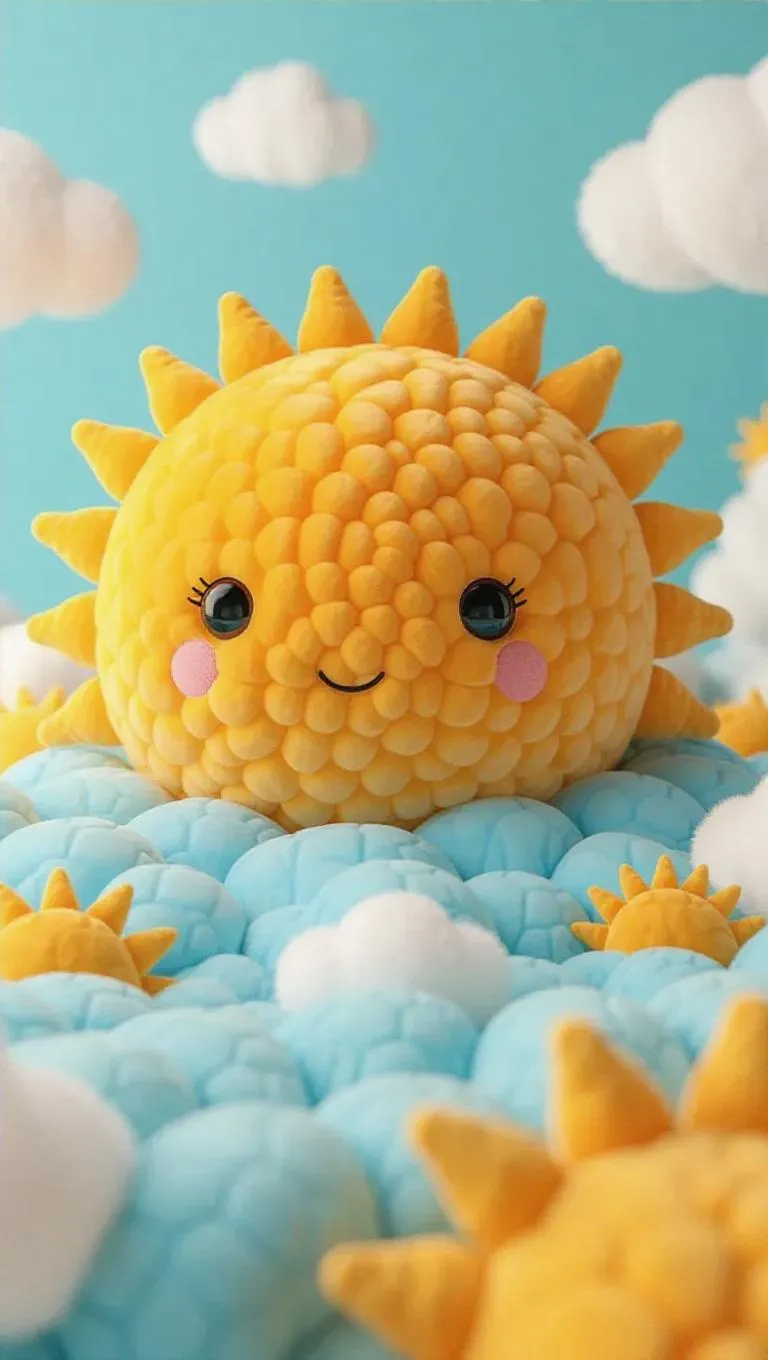 A whimsical depiction of the Sun in Jellycat style, where the solar surface is rendered as a giant, fluffy ball of warm, golden fur. Craters are depicted as plush dimples, and the shadows are gentle and velvety. The entire scene is bathed in soft, warm light, creating a cheerful and inviting atmosphere. The style is playful and cuddly, perfect for a children's book or a cozy home decor piece.