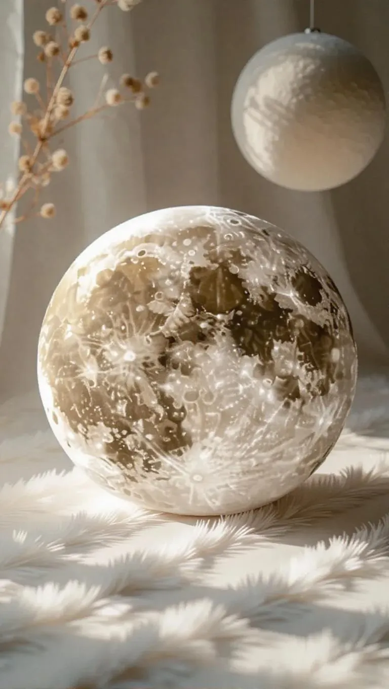 A whimsical depiction of the Moon in Jellycat style, where the lunar surface is rendered as a giant, fluffy ball of soft, silver and gold fur. Craters are depicted as plush dints, and the shadows are gentle and velvety. The entire scene is bathed in soft, dreamy light, creating a whimsical and serene atmosphere. The style is playful and cuddly, perfect for a children's book or a cozy home decor piece.
