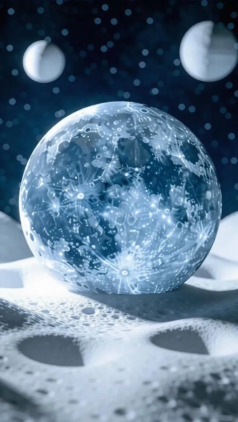 A whimsical depiction of the Moon in Jellycat style, where the lunar surface is rendered as a giant, fluffy ball of soft, pearl-like fur. Craters are depicted as puffy dips, and the shadows are gentle and fuzzy. The entire scene is bathed in soft, ethereal light, creating a dreamy and serene atmosphere. The style is playful and cuddly, perfect for a children's book or a cozy home decor piece.