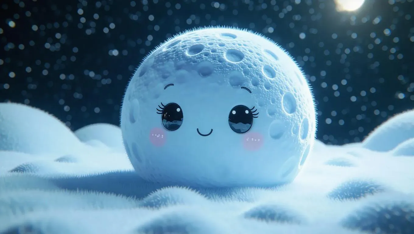 A whimsical depiction of the Moon in Jellycat style, where the lunar surface is rendered as a giant, fluffy ball of soft, silver-blue fur. Craters are depicted as soft, plush bumps, and the shadows are gentle and dreamy. The entire scene is bathed in soft, lunar light, creating a magical and serene atmosphere. The style is playful and cuddly, perfect for a children's book or a cozy home decor piece.