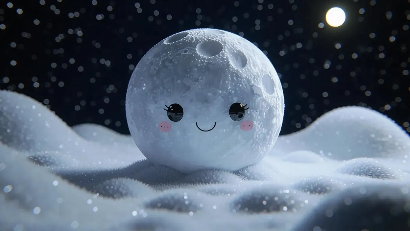 A whimsical depiction of the Moon in Jellycat style, where the lunar surface is rendered as a giant, fluffy ball of soft, greyish-white fur. Craters are depicted as soft patches, and the shadows are gentle and plush. The entire scene is bathed in soft, milky light, creating a soothing and serene atmosphere. The style is playful and cuddly, perfect for a children's book or a cozy home decor piece.