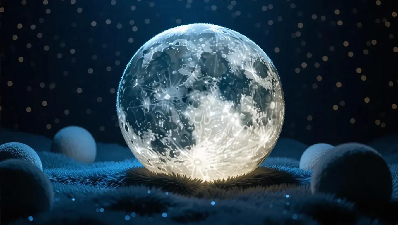 A whimsical depiction of the Moon in Jellycat style, where the lunar surface is rendered as a giant, fluffy ball of soft, shimmering fur. Craters are depicted as plush spots, and the shadows are gentle and luminous. The entire scene is bathed in soft, reflective light, creating a whimsical and serene atmosphere. The style is playful and cuddly, perfect for a children's book or a cozy home decor piece.