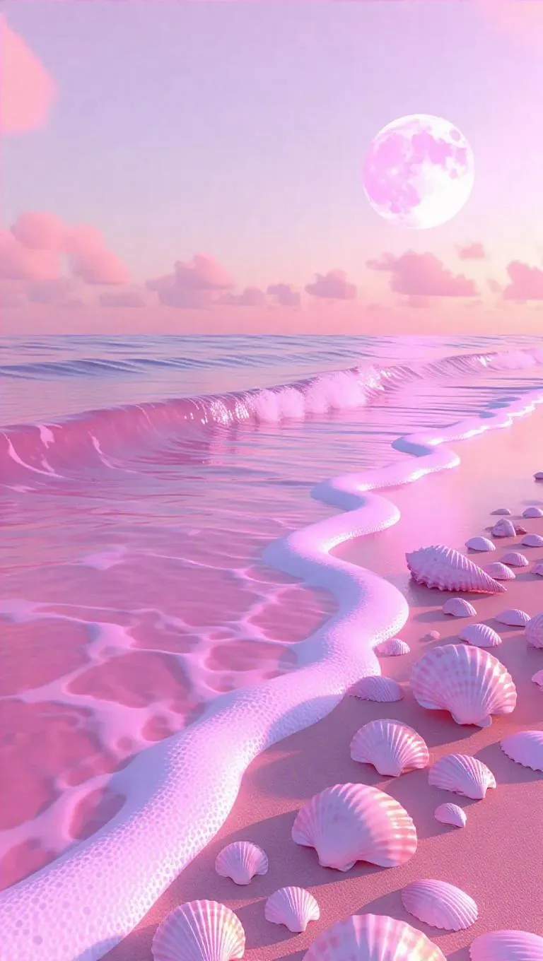 A serene pink world with a vast ocean of bubblegum waves. The shore is lined with pink sand and seashells that shimmer like pearls. Gentle waves crash against the shore, leaving behind trails of iridescent foam. The sky is a soft lavender hue, with a large, glowing pink moon.