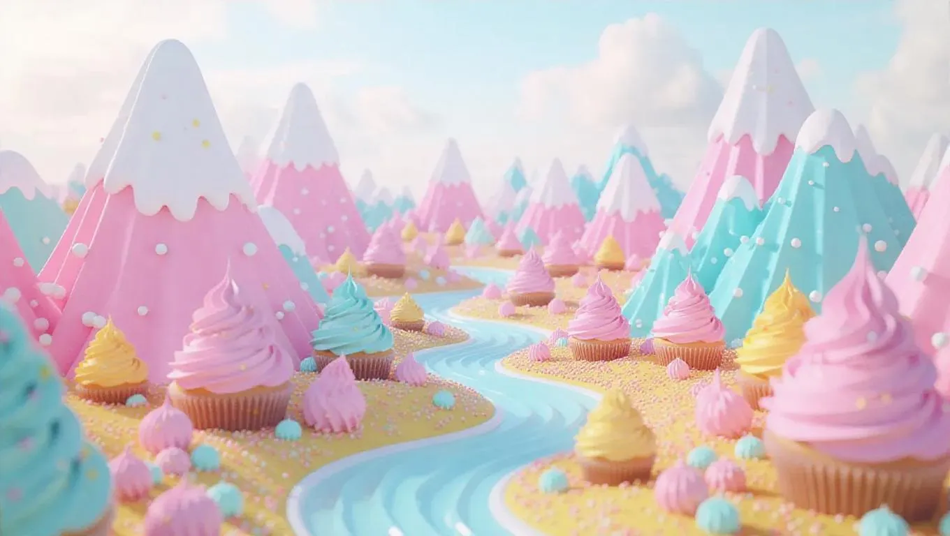 A fantastical sweet world where mountains are made of sweet cotton candy and valleys are filled with rivers of sweet milkshake. The sky is a soft sweet gradient, with fluffy clouds shaped like cupcakes and treats. The landscape is dotted with tiny, glowing sprinkles.