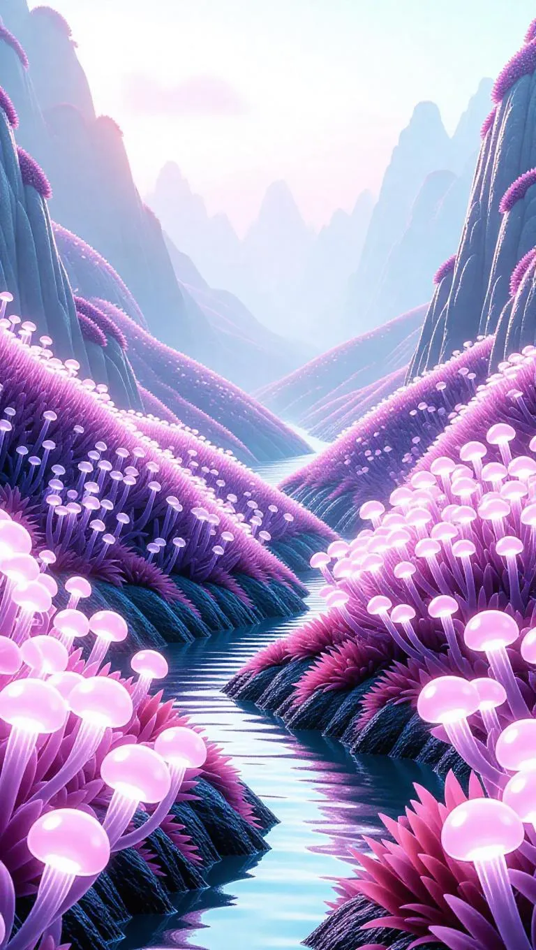 A breathtaking panoramic landscape of a whimsical underwater world. Rolling hills of coral pink moss, seaweed-like bushes with glowing jellyfish flowers, and streams of shimmering sea glass. Soft, dreamy lighting. Style: Impressionistic, pastel colors.