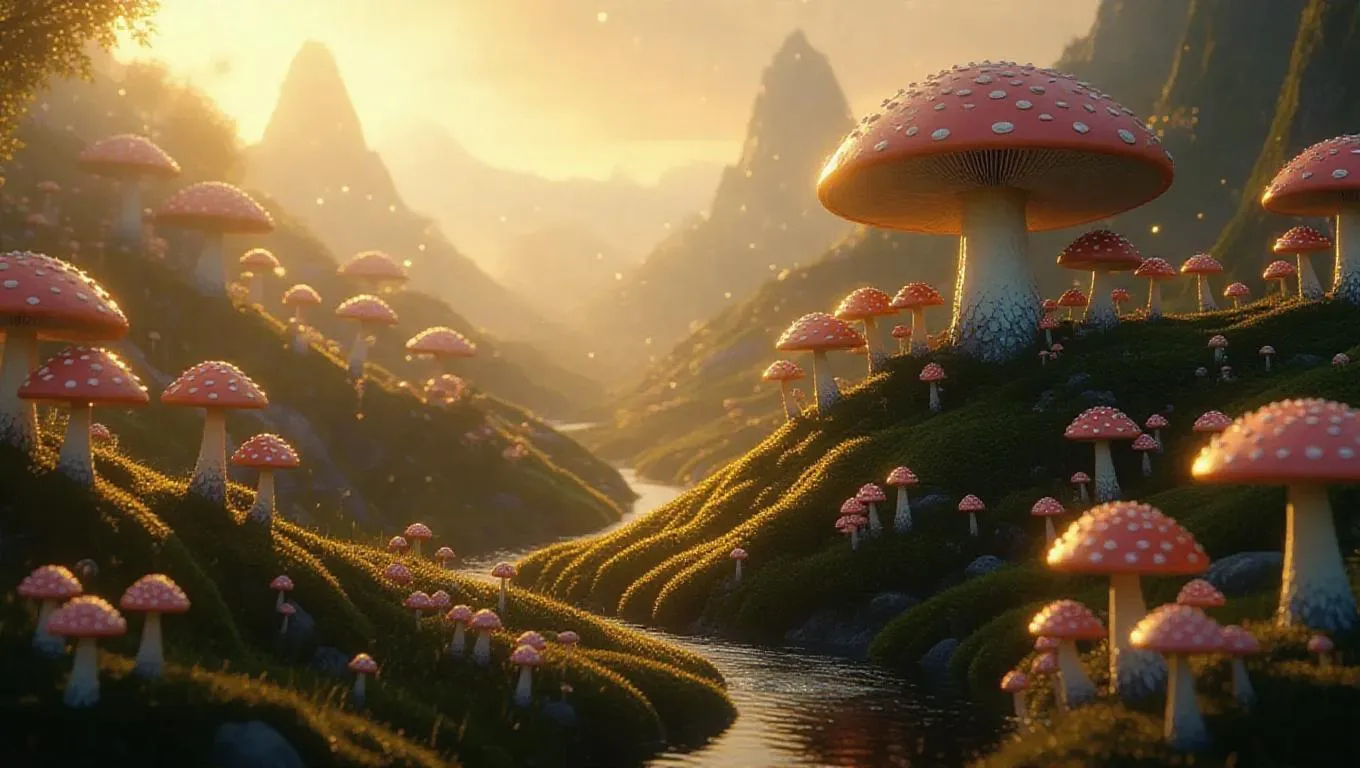 A breathtaking panoramic landscape of a whimsical magical world. Rolling hills of shimmering gold moss, mushroom-like bushes with luminescent flowers, and streams of sparkling fairy dust. Soft, dreamy lighting. Style: Impressionistic, pastel colors.
