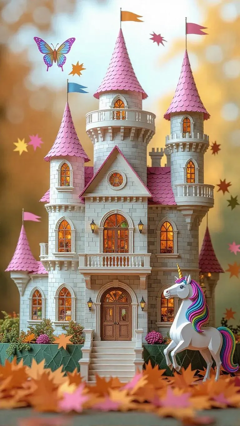 A detailed paper castle with 3 levels, featuring royal chambers, a splendid ballroom, and a cozy library, furnished with tiny enchanted furniture. A fairy leaps joyfully in front, next to a rainbow unicorn standing outside. The scene is accessorized with falling paper leaves, creating a playful and enchanting paper world.