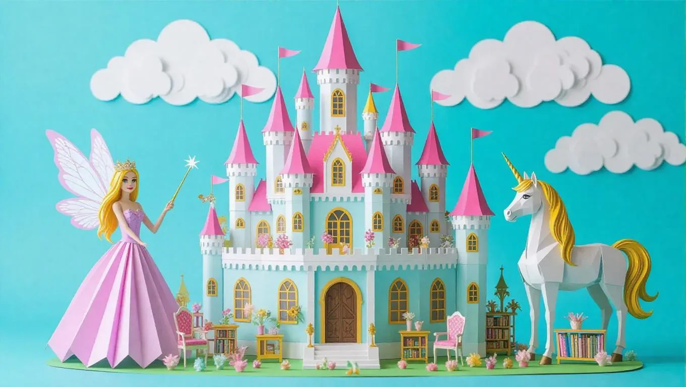 A detailed paper castle with 3 levels, featuring royal chambers, a splendid ballroom, and a historical library, furnished with tiny enchanted furniture. A fairy displays her wand proudly in front, next to a striking unicorn standing outside. The scene is brightened with whimsical paper clouds, creating a lively and enchanting paper world.