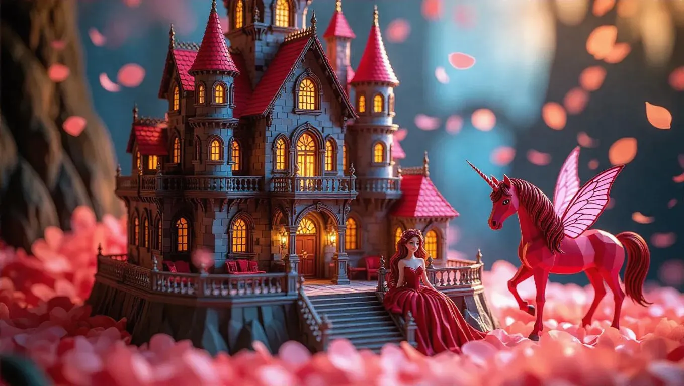 A detailed paper castle with 3 levels, featuring royal chambers, a romantic ballroom, and a futuristic library, furnished with tiny enchanted furniture. A fairy lounges in a relaxed pose in front, next to a crimson unicorn standing outside. The scene is filled with cascading paper petals, creating a dreamy and enchanting paper world.