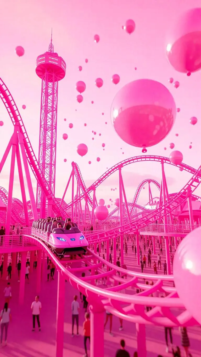 A pink world where a futuristic amusement park is filled with pink roller coasters and rides. The park is bustling with people enjoying the attractions, and the sky is filled with pink balloons and confetti. Soft pink lights illuminate the scene, creating a fun and vibrant atmosphere.