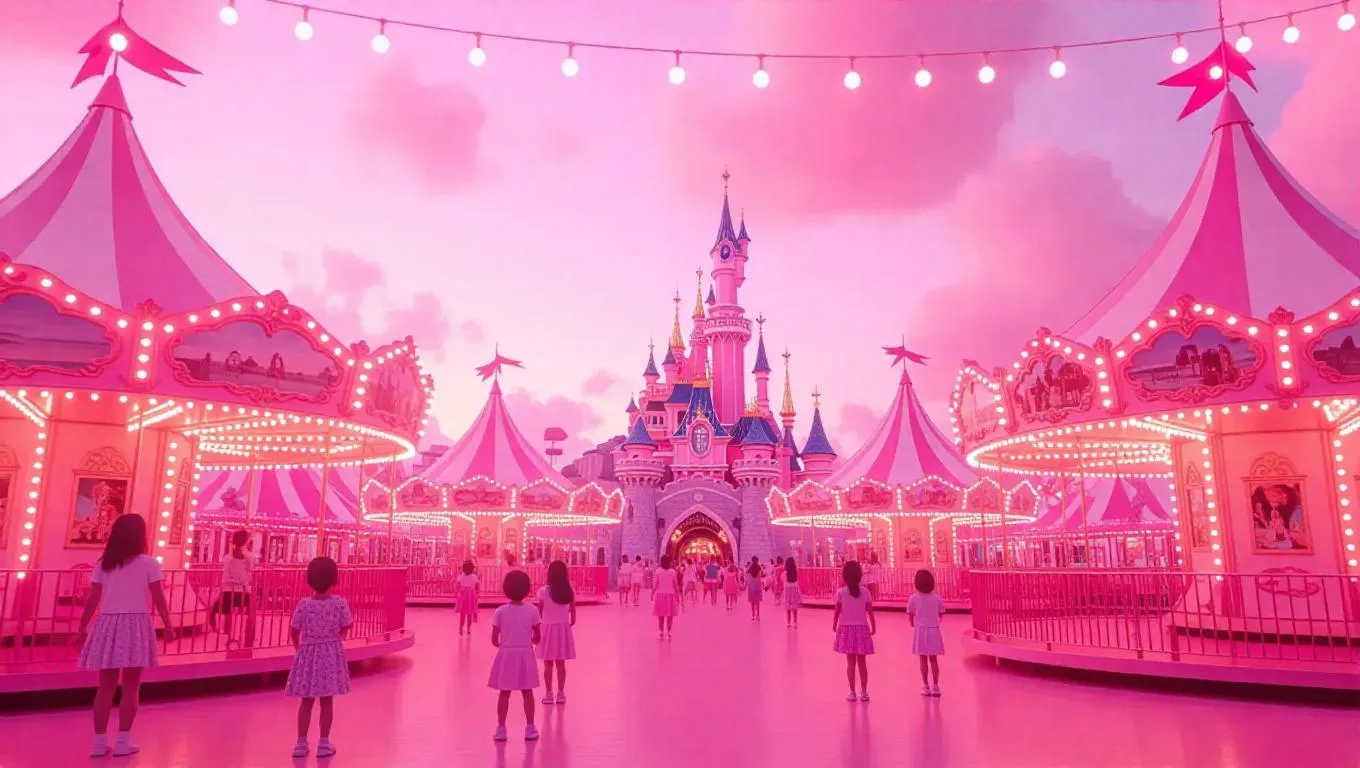 A pink world where a dreamlike amusement park is filled with whimsical rides. The park is bustling with children enjoying the attractions, and the sky is filled with pink clouds and fairy lights. Soft pink lights illuminate the scene, creating a dreamy atmosphere.