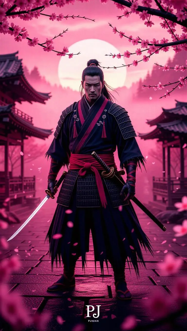 A legendary ronin stands ready in a dreamlike village square bathed in soft rosy hues. Cherry blossoms drift through the air, their petals glowing under the ethereal pink mist that blankets the scene. The ronin, clad in elegantly detailed tattered robes with crimson and pink accents, holds a gleaming wakizashi reflecting the warm blush of the sky. A distant tea house and mist-covered fields fade into the background, enhancing the serene yet powerful atmosphere. The mood is a fusion of resilience and tranquility, blending traditional ronin aesthetics with a surreal, rosy-hued fantasy world. Cinematic, semi-realistic with soft fantasy elements and a painterly touch.