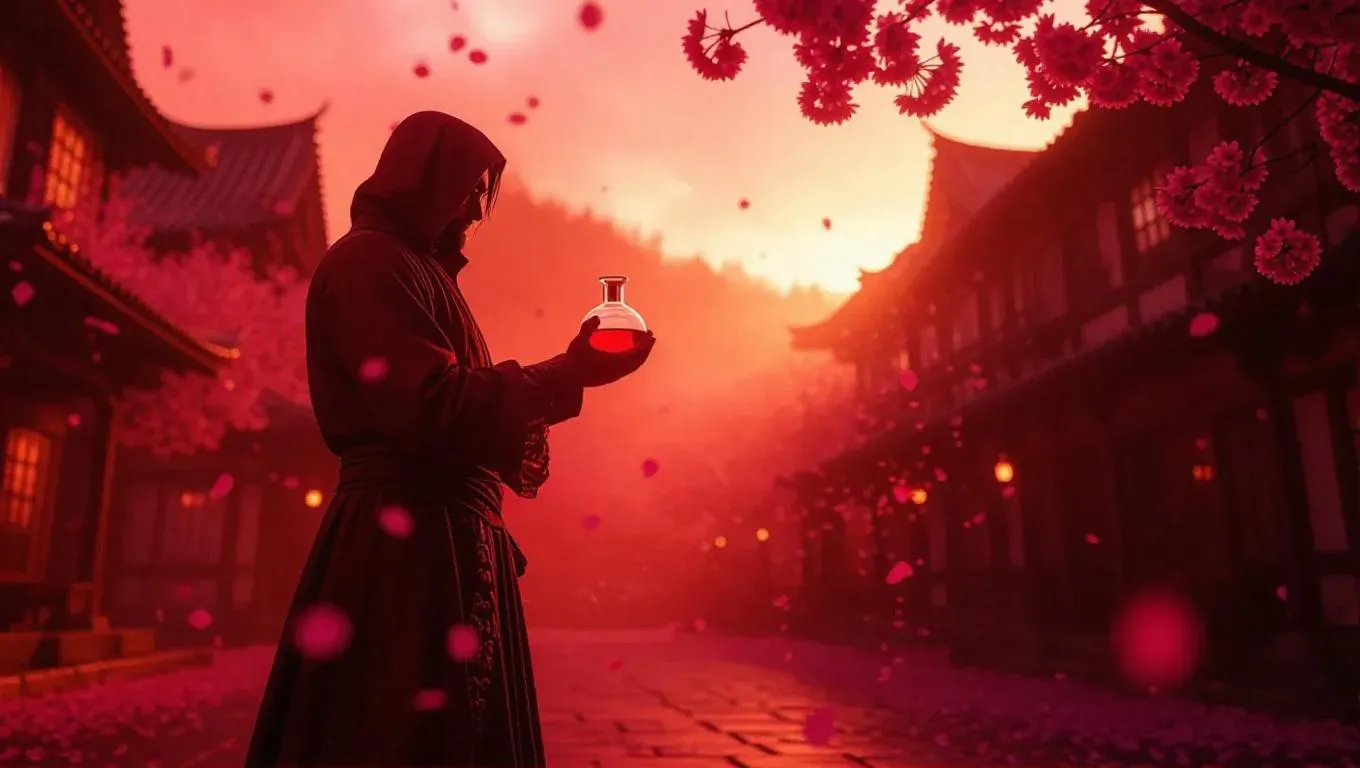 A fabled alchemist stands ready in a dreamlike village square bathed in soft crimson hues. Cherry blossoms drift through the air, their petals fluttering under the ethereal red mist that blankets the scene. The alchemist, clad in elegantly detailed tattered attire with crimson and gold accents, holds a gleaming flask reflecting the warm colors of the sky. A distant laboratory and mist-covered meadows fade into the background, enhancing the serene yet powerful atmosphere. The mood is a fusion of experimentation and harmony, blending traditional alchemist aesthetics with a surreal, crimson-hued fantasy world. Cinematic, semi-realistic with soft fantasy elements and a painterly touch.
