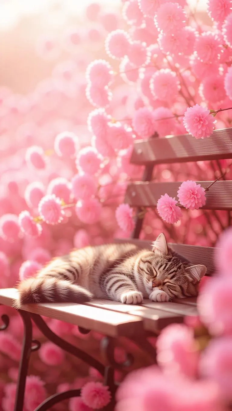 A delicate pink world where a small cat is napping on a garden bench surrounded by pink flowers. The sunlight casts a soft glow on the cat’s fur, and the air is filled with the scent of blooming flowers. The scene feels peaceful and cozy.