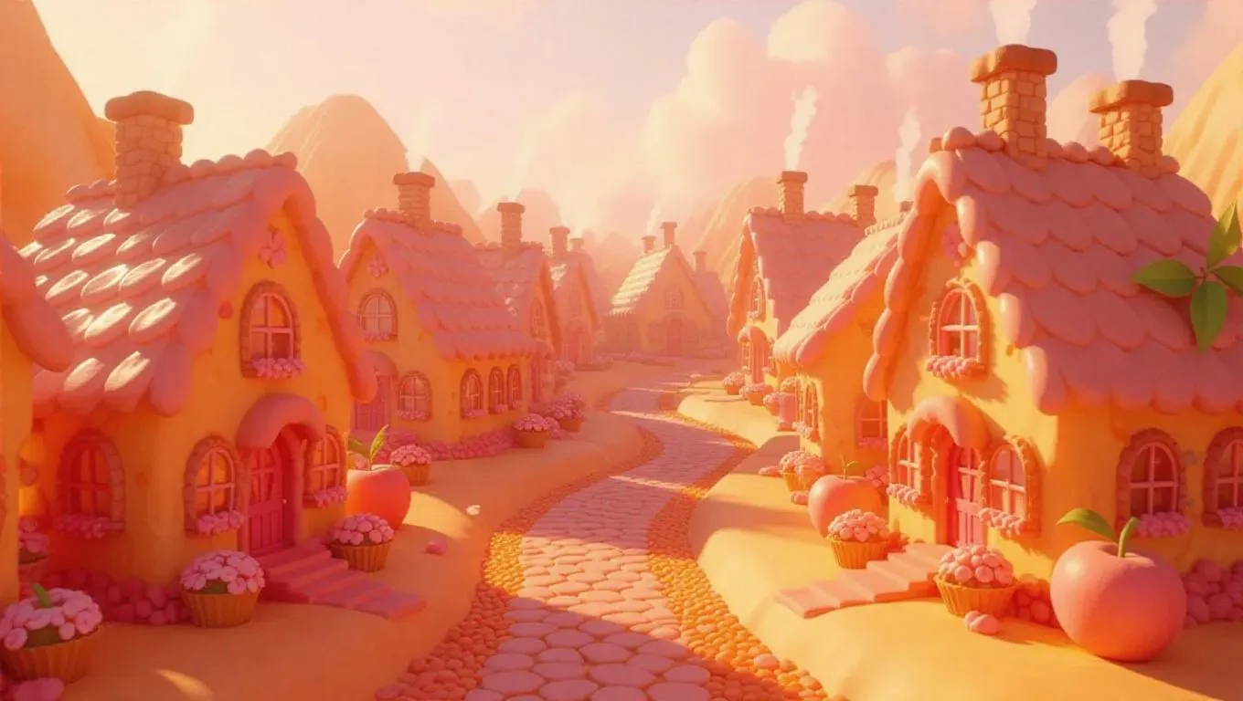 A charming peach world with a village made entirely of peach pastries. The houses are shaped like peach tarts, cakes, and cookies, with chimneys emitting plumes of peach-scented smoke. The streets are paved with peach sugar, and the sky is a warm soft peach color.