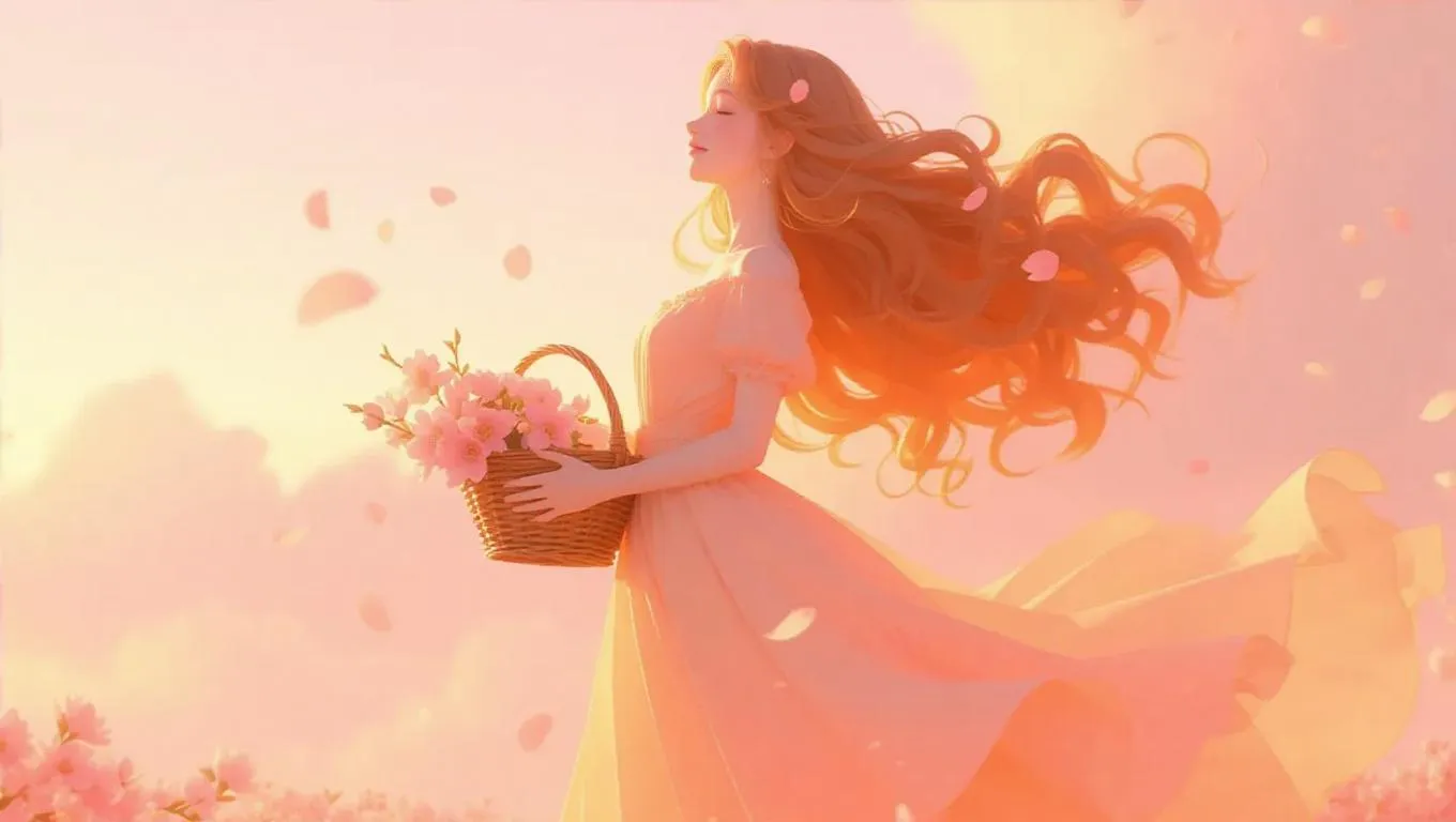 A serene landscape with soft peach hues dominates the scene. A young woman with cascading peach curls stands gracefully, wearing a flowing peach gown that sways gently in the breeze. She holds a basket of peach blossoms, her eyes closed in a serene smile. The sky is a gradient of pastel peaches and yellows, with a peach-tinted sunrise casting warm, soft light from the side. Peach petals drift through the air, adding a dreamy, romantic atmosphere. The style is ethereal and whimsical, with a touch of realism.