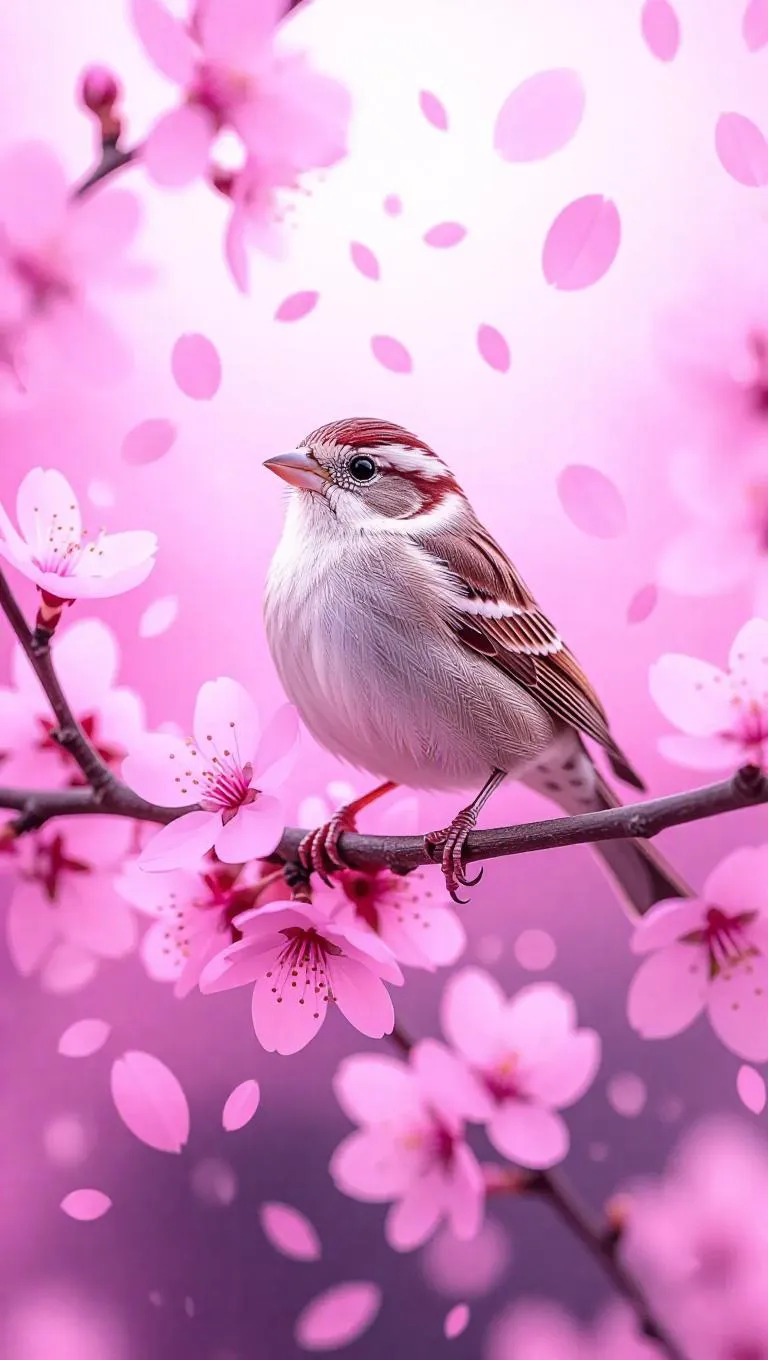 A pastel pink world where a tiny finch is perched on a branch of a pink-flowered tree. The bird is chirping softly, and the sky is a soft lavender hue. Pink petals drift gently through the air, creating a whimsical atmosphere.