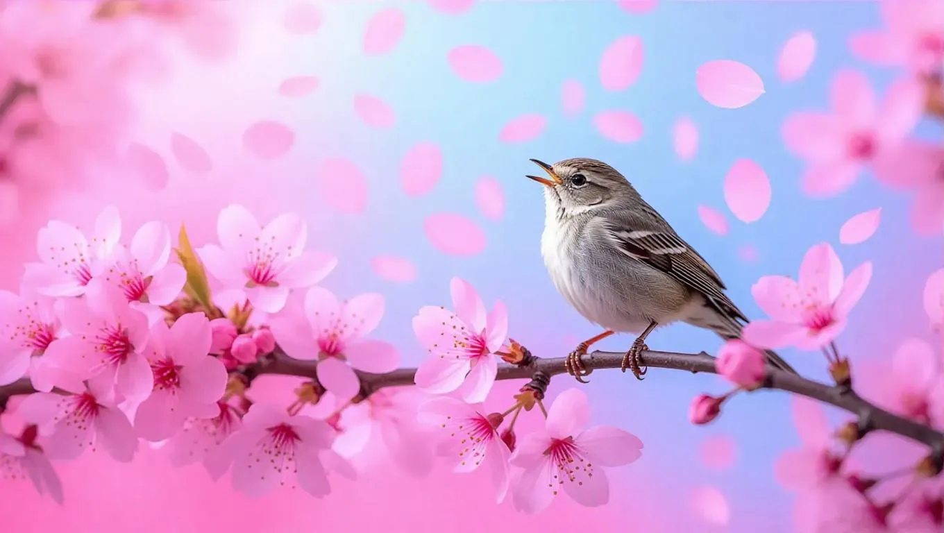 A pastel pink world where a tiny bird is perched on a branch of a pink-flowered tree. The bird is singing sweet melodies, and the sky is a soft lavender hue. Pink petals spiral gently in the air, creating a whimsical and serene atmosphere.