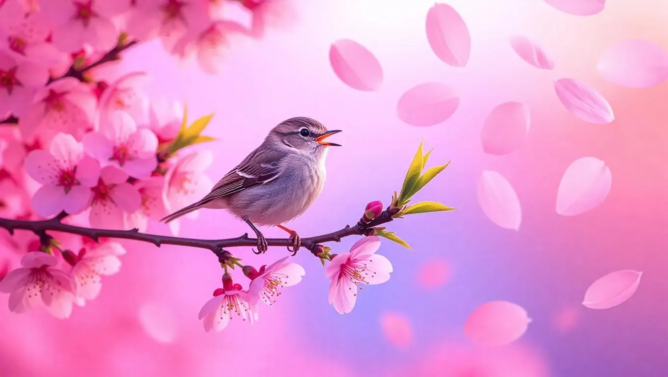 A pastel pink world where a tiny bird is bouncing playfully on a branch of a pink-flowered tree. The bird is singing softly, and the sky is a soft lavender hue. Pink petals float slowly through the air, creating a whimsical and enchanting atmosphere.