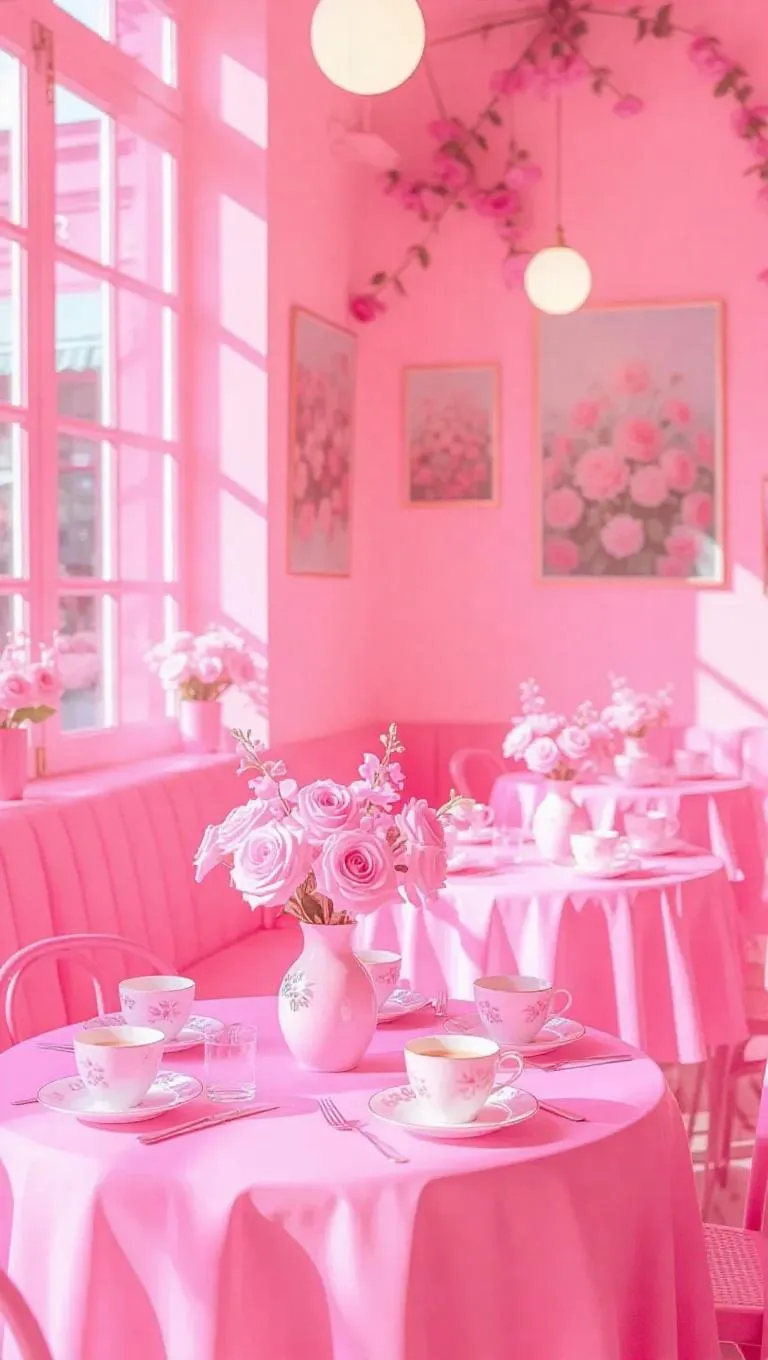 A pink world where a cozy café is filled with pink-themed decor. The walls are adorned with pink flowers and pastel-colored paintings, and the tables are set with pink tablecloths and pink tea sets. Soft pink light filters through the windows, creating a warm and inviting atmosphere.
