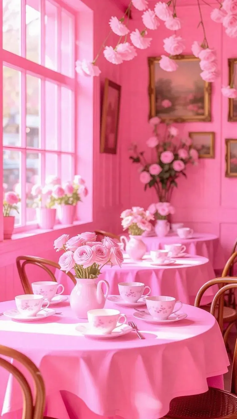 A pink world where a rustic café is filled with pink-themed decor. The walls are adorned with pink flowers and vintage paintings, and the tables are set with pink tablecloths and pink tea sets. Soft pink light filters through the windows, creating a warm and inviting atmosphere.