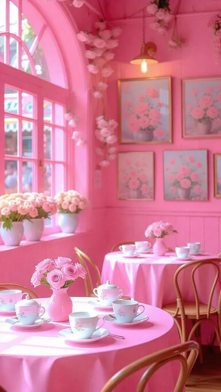 A pink world where a cozy café is filled with pastel-themed decor. The walls are adorned with pastel flowers and pastel-colored paintings, and the tables are set with pastel tablecloths and pastel tea sets. Soft pastel light filters through the windows, creating a warm and inviting atmosphere.