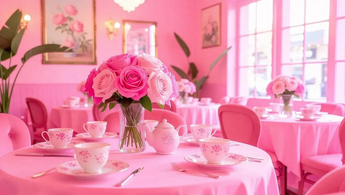 A pink world where a cozy café is filled with art deco-themed decor. The walls are adorned with pink flowers and art deco-style paintings, and the tables are set with pink tablecloths and art deco pink tea sets. Soft pink light filters through the windows, creating a warm and inviting atmosphere.