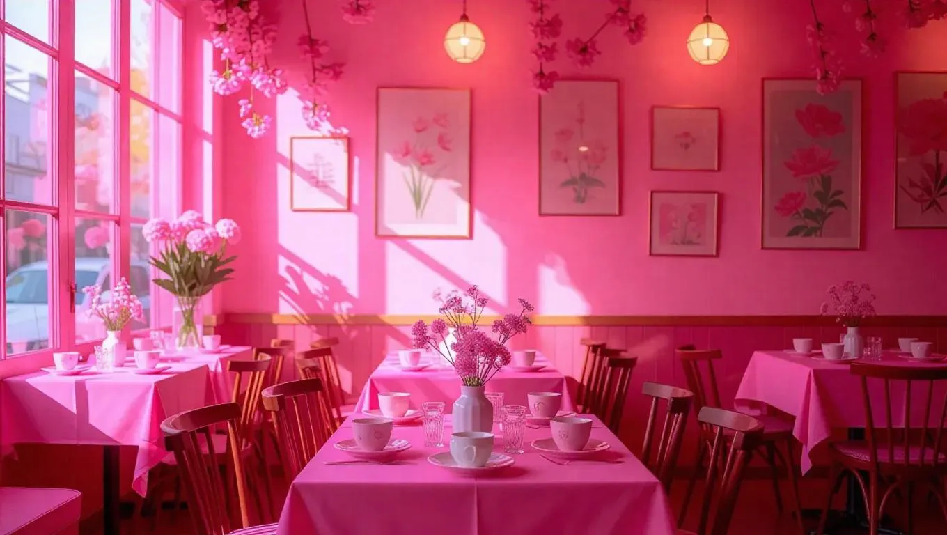 A pink world where a cozy café is filled with zen-themed decor. The walls are adorned with pink flowers and calming paintings, and the tables are set with pink tablecloths and pink tea sets. Soft pink light filters through the windows, creating a warm and inviting atmosphere.
