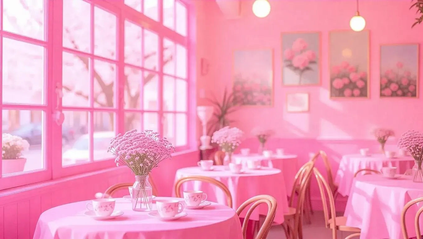 A pink world where a cozy café features large windows filled with pink-themed decor. The walls are adorned with pink flowers and pastel-colored paintings, and the tables are set with pink tablecloths and pink tea sets. Soft light filters through the windows, creating a warm and inviting atmosphere.