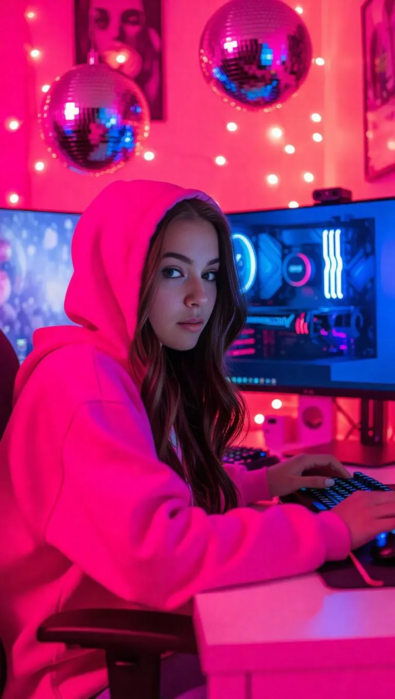 A 25-year-old American girl in a bright pink hoodie, surrounded by a playful pink room adorned with disco balls and gaming stickers, intensely focused on playing video games on her advanced computer setup, with a wide screen displaying vivid graphics and gamepads arrayed on the desk.