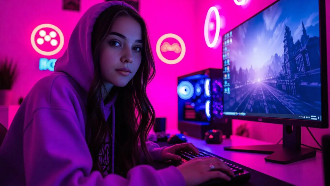 A 25-year-old American girl in a purple hoodie, surrounded by a playful pink room adorned with glowing neon signs and gaming stickers, intensely focused on playing video games on her advanced computer setup, with a wide screen displaying vivid graphics and gamepads scattered around.
