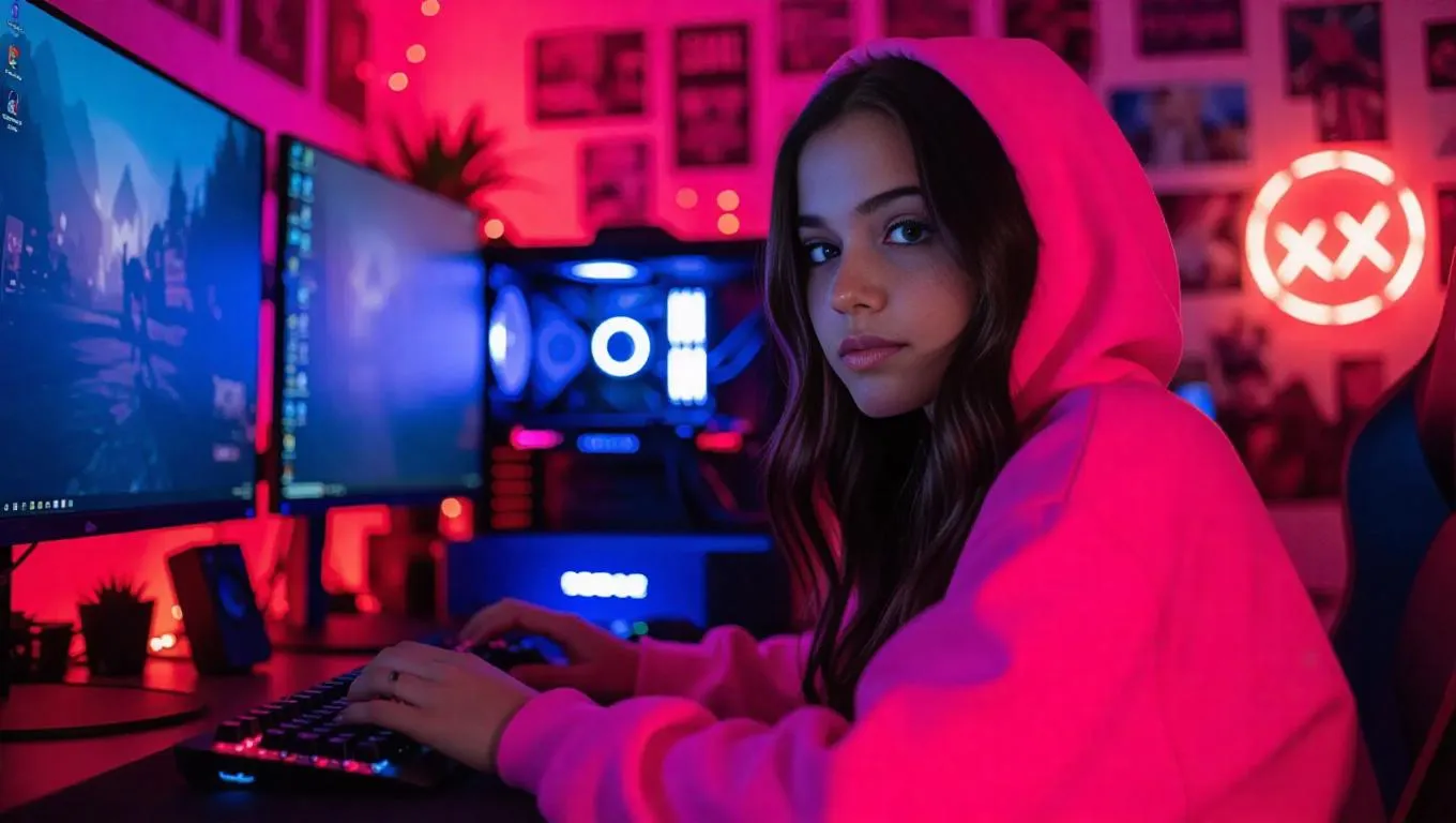 A 25-year-old American girl in a bright pink hoodie, surrounded by a playful black room adorned with glowing neon signs and gaming stickers, intensely focused on playing video games on her advanced computer setup, with a wide screen displaying vivid graphics and gamepads scattered around.